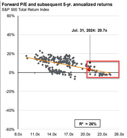 Over the last 20 years, when the P/E ratio has been in the 20-27 range, the bulk of the subsequent annual 5-year returns have been negative, with only a few periods rising to mid-single digits.